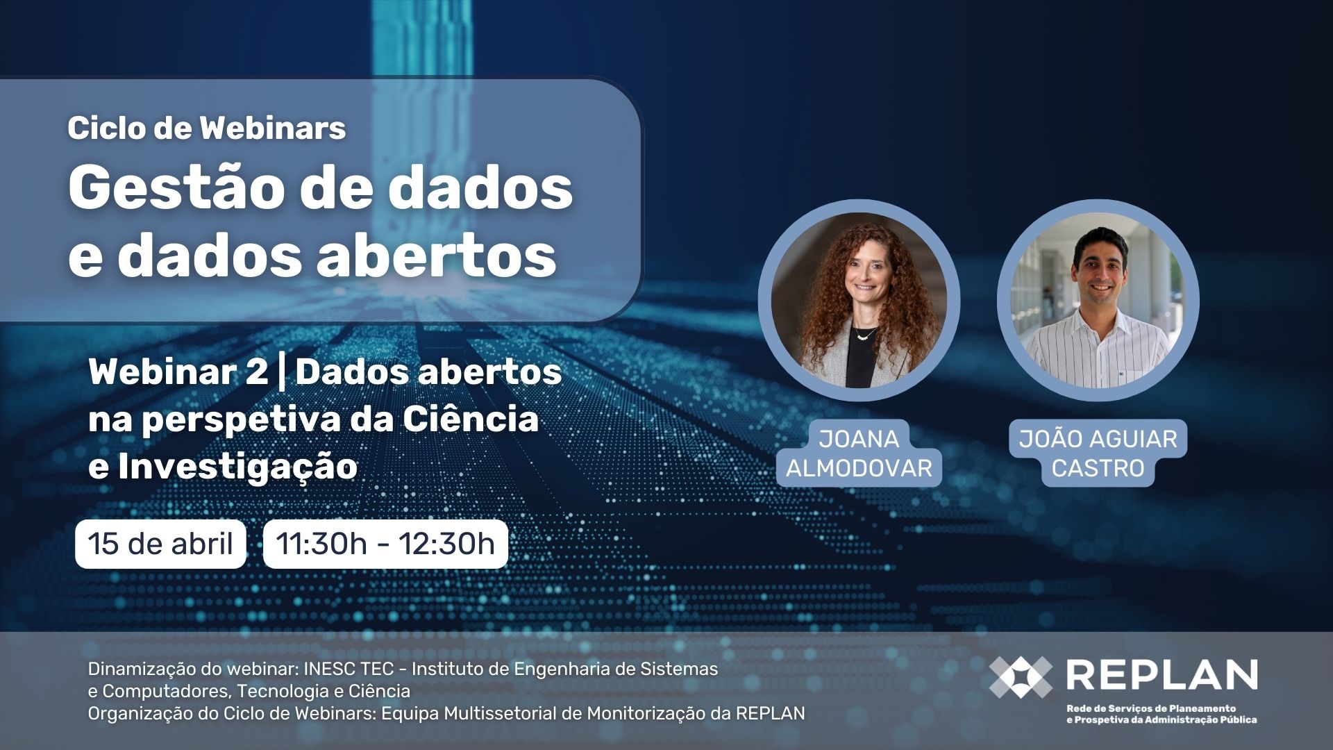 - 15 de abril (inscrição): “Dados abertos na perspetiva da ciência e investigação”, dinamizado pelo Instituto de Engenharia de Sistemas e Computadores, Tecnologia e Ciência (INESC TEC);