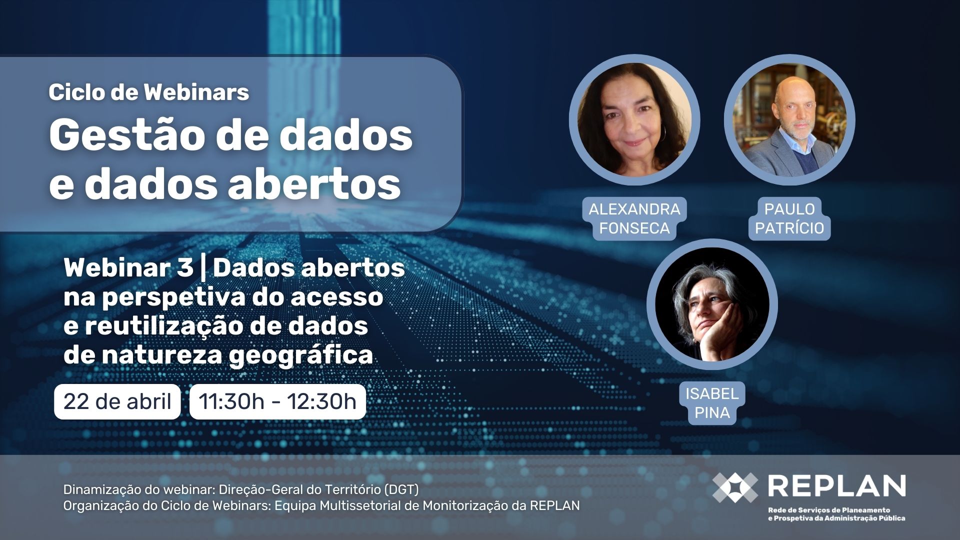- 22 de abril (inscrição): “Dados abertos na perspetiva do acesso e reutilização de dados de natureza geográfica”, dinamizado pela Direção-Geral do Território (DGT).